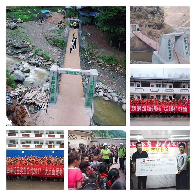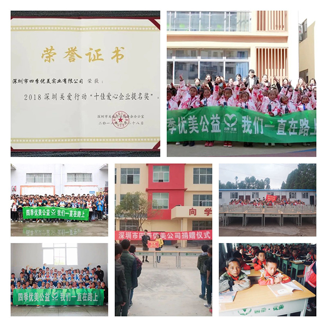 賑災(zāi)捐款,參與健康類公益救助項(xiàng)目,捐建校舍、橋梁,改造校園設(shè)施等,檢驗(yàn)著四季優(yōu)美投身公益活動(dòng)的成色。深圳關(guān)愛行動(dòng)“十佳愛心企業(yè)”提名獎(jiǎng)的殊榮,是對(duì)四季優(yōu)美長期堅(jiān)持公益的肯定。而逐年推進(jìn)的“暖冬”活動(dòng)及“一加一”資助行動(dòng),更已成為具有四季優(yōu)美文化內(nèi)涵的公益品牌。