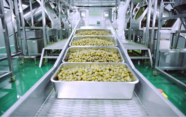 裹粉后的糖漬青梅被傳送在60米長的一個通道,中間不能有任何的人為接觸,溫度從60度升到120度,在30分鐘之內,完成高溫滅菌。隨后進入無菌冷卻車間,這兒要完成傳送帶降溫、兩次人工揀選、金屬探測儀檢測幾個環節,才可以進入包裝流水線。